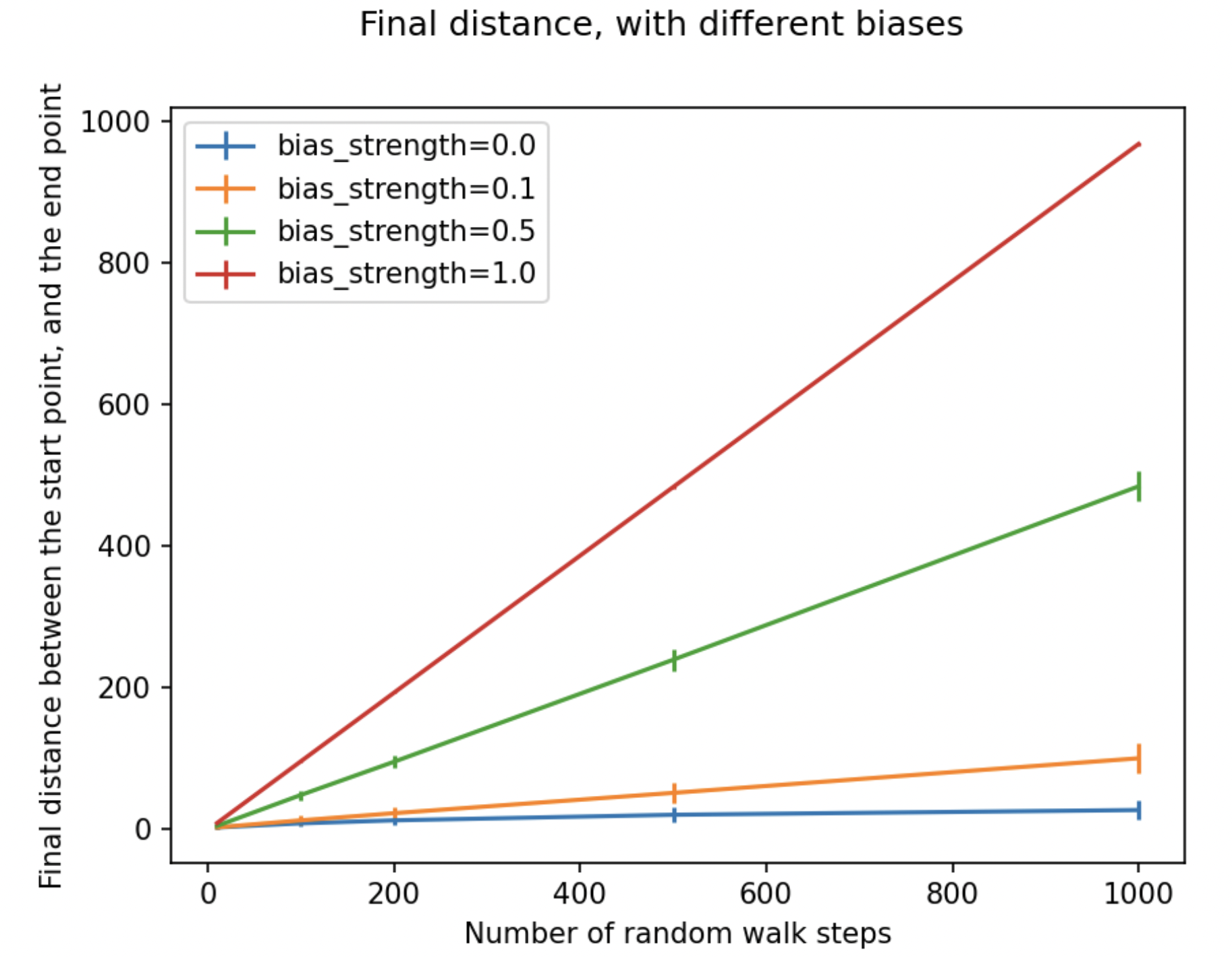 Another way to see this, is to plot the “final distances” you cover after 100 “random” steps, for different strengths of bias. “Final distance” being the distance between your starting point and your position in the very last step:
